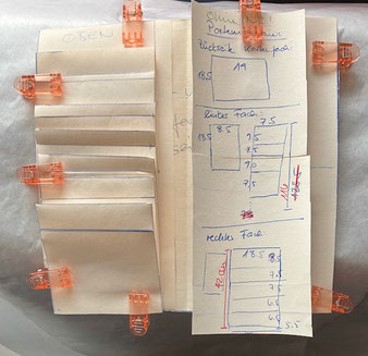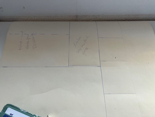 Leider habe ich nicht gedacht, dass der Stoff so „lebendig“ ist und schwierig zum Zuschneiden - aber es ist geschafft; die Schnittteile sind alle geschnitten und ich bin dabei, den Rock in Falten zu legen.